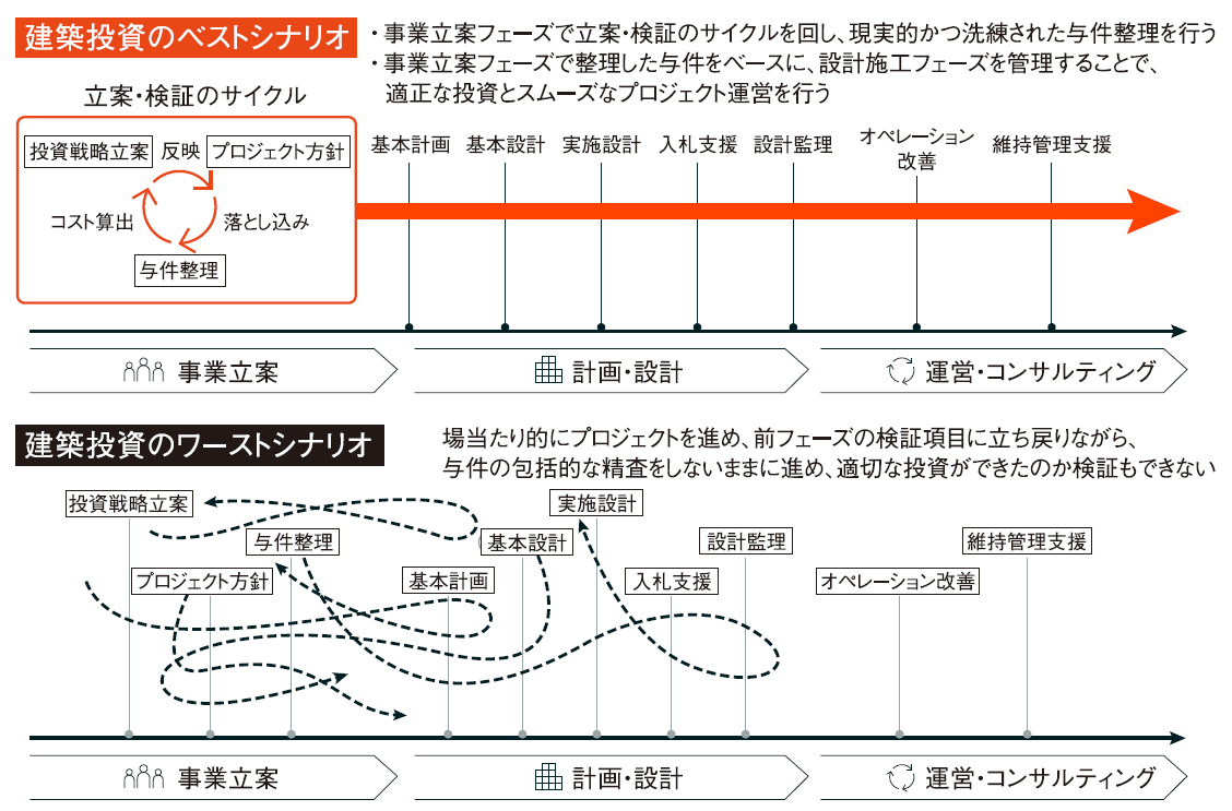 「当社のサービス最大の特徴は、クライアント様が事業を立案する段階からプロジェクトに関わることです。CM会社は主に設計及び施工プロセスのマネジメントを行うため、関わるのは設計段階からです。そこが大きな違いです。事業立案段階で『本当に必要なものは何か』を明確化し、機能やスケジュールなどの要件を整理しておけば、工程や予算に対する制約が効果的に働き、追加要件も出にくくなり、プロジェクトはスムーズに進みます」。
